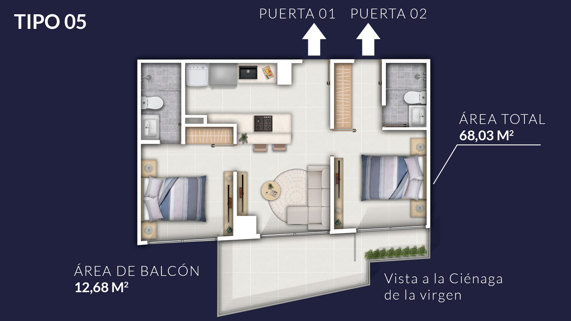 El más exclusivo del proyecto. Con dos habitaciones y vistas panorámicas duales, ofrece el máximo confort y las mejores oportunidades de inversión.
